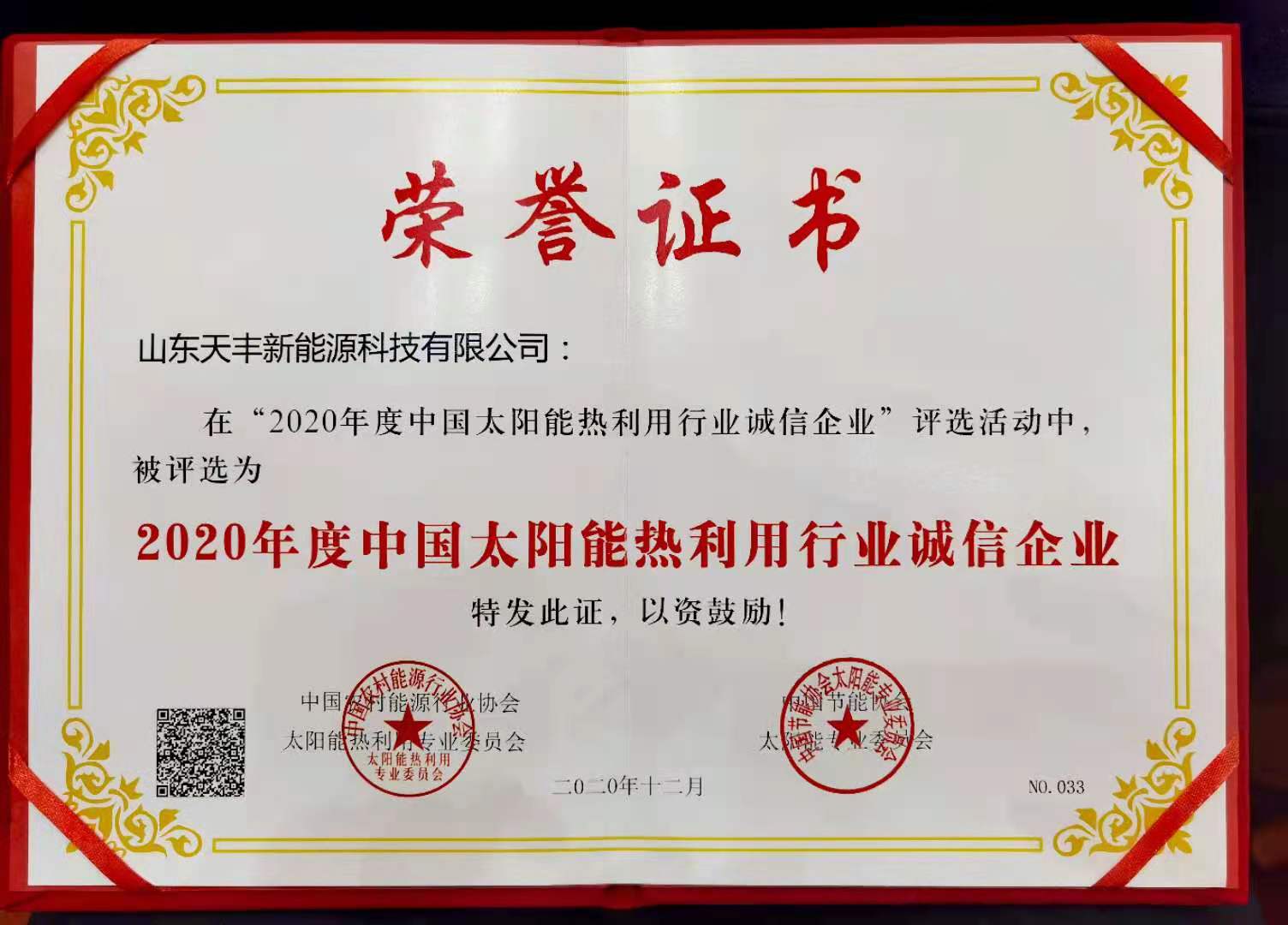 正是憑借良好的企業(yè)信用,創(chuàng)建優(yōu)良精品工程的企業(yè)形象,天豐在市場不斷積攢良好的口碑。“中國太陽能熱利用行業(yè)誠信企業(yè)”榮譽證書的獲得,是行業(yè)對天豐始終堅持誠信經(jīng)營的肯定。天豐將繼續(xù)以此為契機,通過加強信用、合同等管理,在互信互助、坦誠合作的基礎(chǔ)上不斷開拓進取,以質(zhì)量促誠信,以誠信鑄未來!