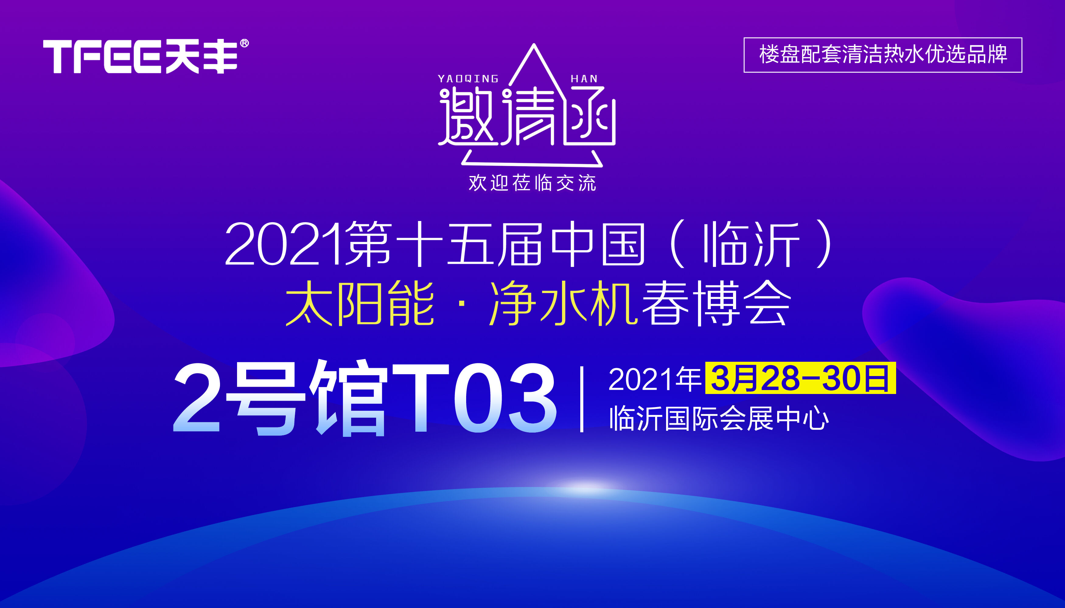 3月28日-30日,第十五屆中國(臨沂)太陽能?凈水機春博會(以下簡稱春博會)將在臨沂國際會展中心開幕,作為受行業(yè)關注的實力品牌之一,在會上,天豐新能源也將攜硬核產品矩陣盛裝亮相,鎖定2號館T03展位,呈現全資質全系列精品以及光熱專業(yè)工程場景解決方案,以C位之勢,打造行業(yè)一流品牌盛宴。